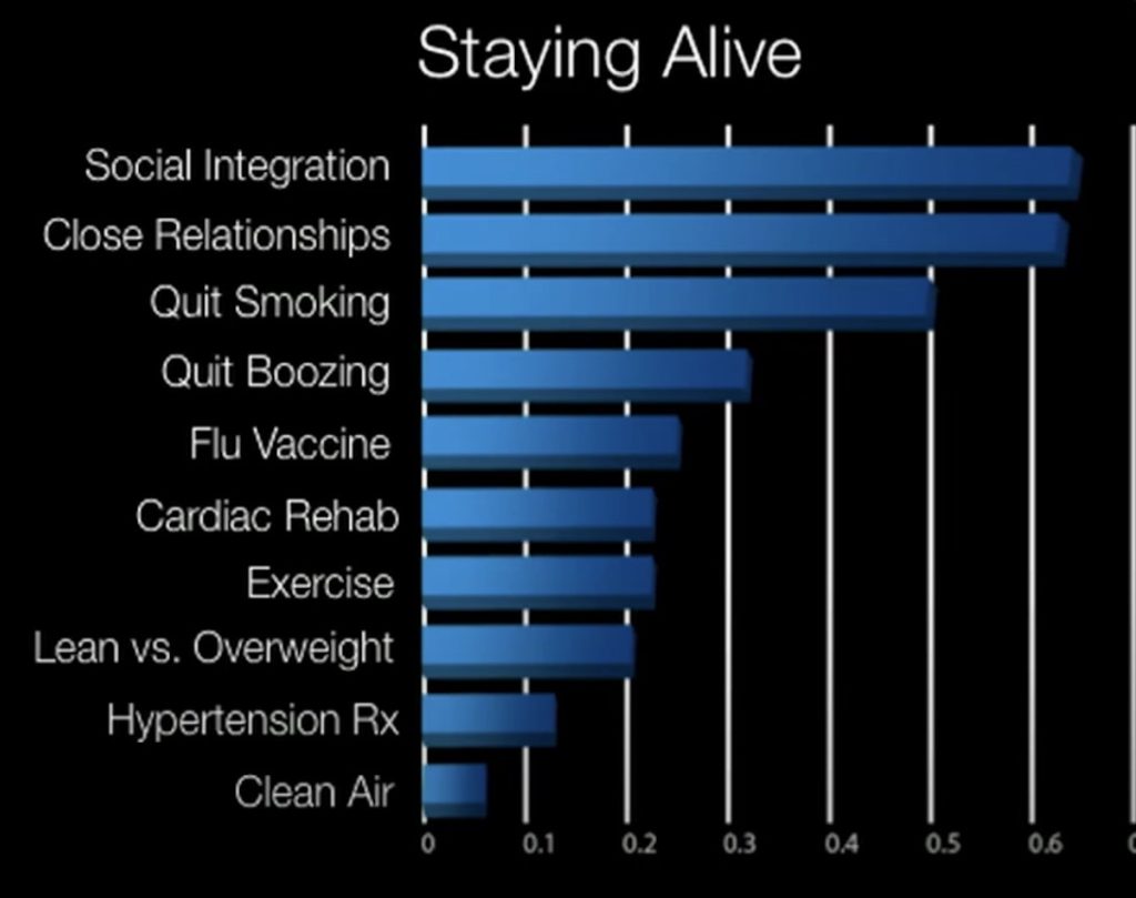 I was listening to a TED talk from Jan 28, 2017 tonight about the factors that contribute to longevity. The chart produced from a long term study was quite revealing of the things that have the greatest determining contribution to living to 100. By far the strongest indicators of longevity are both social factors. Look how far down the line overweight and exercise are by comparison. Number one, social interaction is how much you interact with people as you move through your day. How many people do you talk to in a day? Not just the close intimate clutch of 3-4 people who are confidantes or you’r “go to” friends or family for things youj need or for heartfelt communication. Do you speak to service workers, neighbors, strangers at the grocery store, etc. the more interactive you are socially, the better you feel about having a few close people to count on,, the longer you are likely to live.