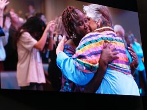 The true source and purpose of that wellspring of empathy was felt in a deep and personal way in a panel session at New Room on Thursday as a speaker said, “America is not our native land. West Africa is not our native land.  Eden is our native land.”. A dam broke in me. It seemed joyful enough in the moment…. a high-five “YES!” kind of moment. I began to quiver. I saw a Black sister in a pink shirt standing before the stage with her hands up. In my spirit I heard, “Go stand with her.”. My feet dragged.  “Go.” I moved slowly toward the front.  Again, “Go.” I worked my way over to her, stood beside her and cried. I modeled her postures and began praying out loud, trying to connect, confessing for not understanding the depth of what God was saying to me ….. that we face a generational woundedness that is centuries old…….Hers? Mine? Both? What do I do?