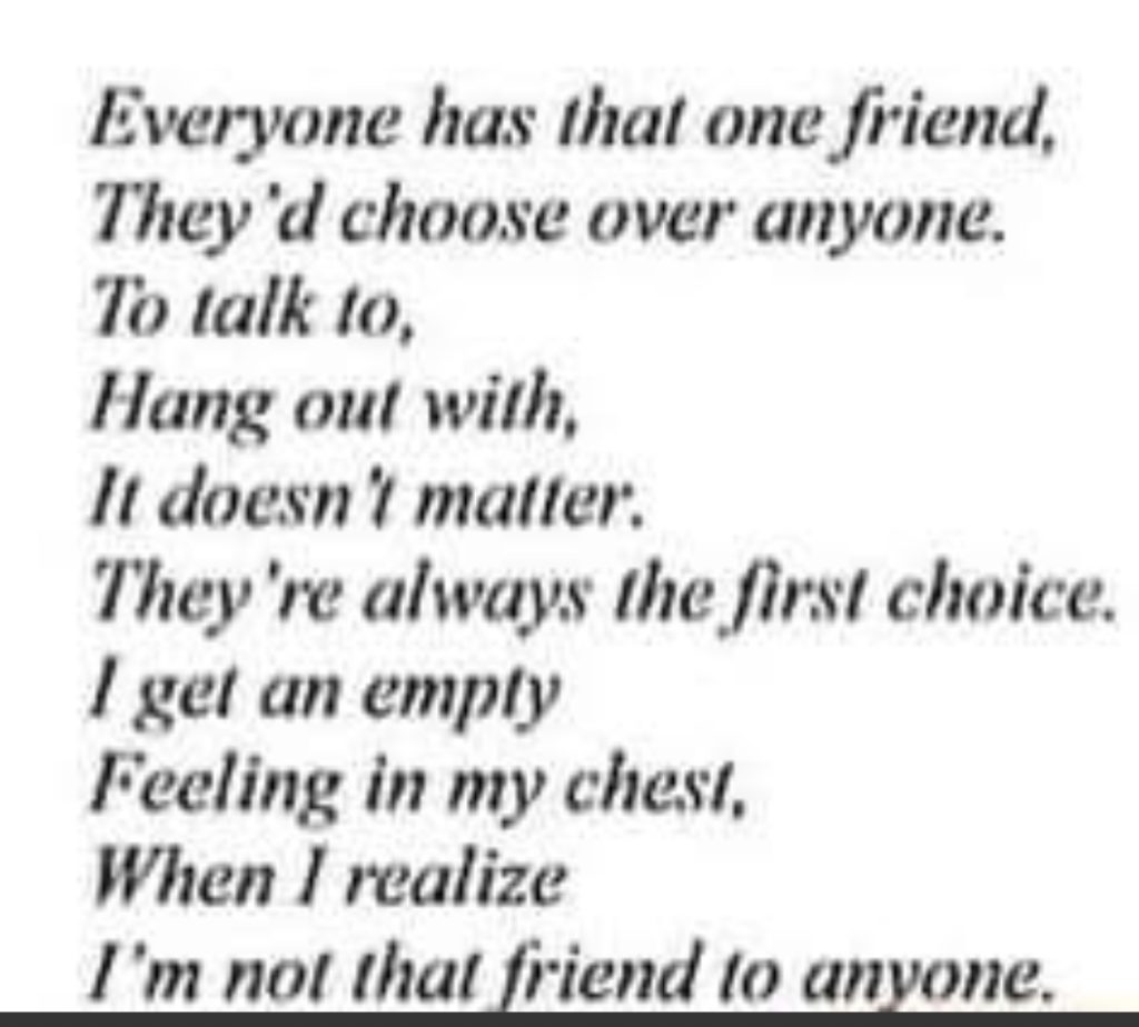 A young woman I know wrote this poem. It was so poignant. I felt that pain in my 20s and 30s.I felt this great loneliness for many years then realized God was sending several people for whom I WAS to be that person. Problem was I didn’t WANT to be that person for them! I had to learn to be a friend. to the friendless before I could have that kind of friend. (CBB 11/12/19)