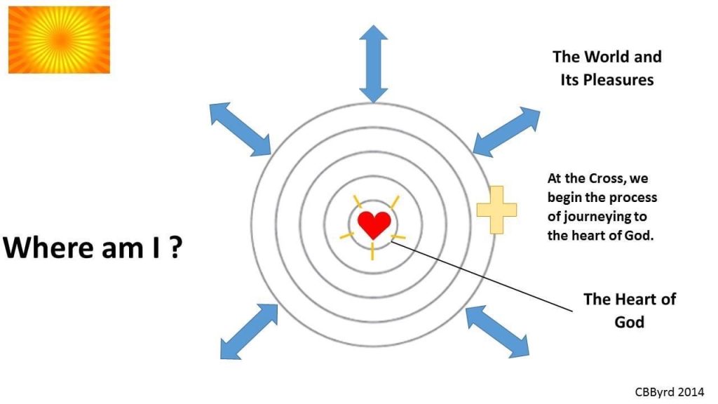 This is a diagram that arose out of considerations of how we are called to be “light” in the world and what that looks like for one whose ministry is on the periphery…at the point where the culture and the Kingdom meet…connecting the church with the world and the world with the church, which is the calling of a deacon in the United Methodist Church. So, as I was thinking about how to draw people into the life of faith community, I realized that people operate out of greater or lesser degrees of closeness to the heart of Christ, depending on how much of God we want and how much of ourselves we’re willing to give. And I realized that my “orbit” around that heart of Christ varies and can be greatly affected by devotional practices, circumstances in my life, distractions that I allow, time spent in fellowship with others, and more. How aware are we of our own or others’ movement near or distant from the heart of Christ? Are we “stuck” somewhere out in the outer limits, wholly caught up in the things of the world or complacent, unchallenged, and reluctant, for whatever reason, to move closer to Christ?