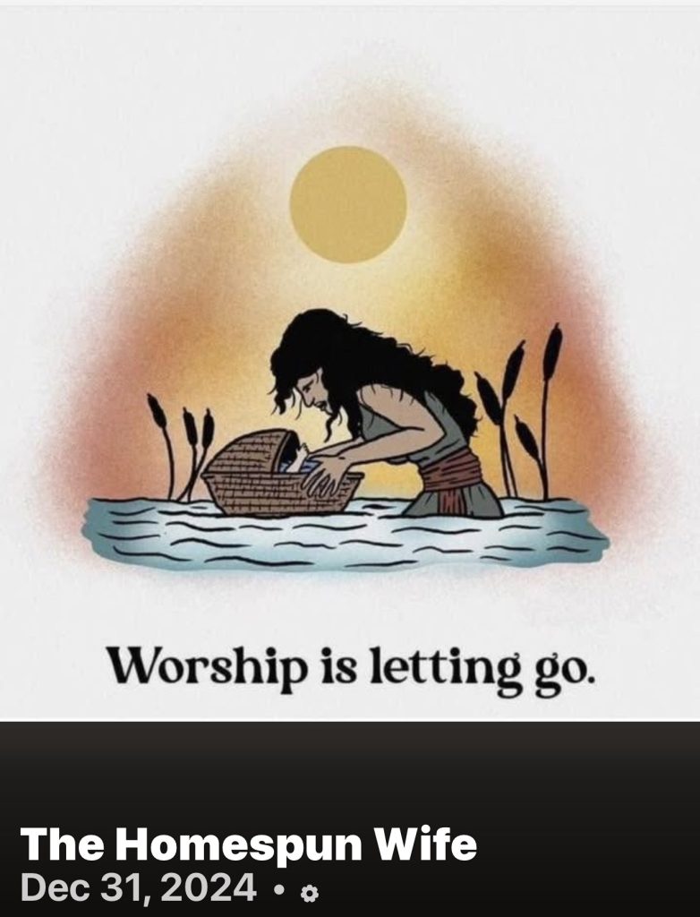 | Addendum 1/1/26: I don’t know who needs to see this, but I needed it yesterday. This image of Jochebed placing Moses in the basket and pushing him into the river profoundly impacted me. In my heart I could feel her fear, her pain, her questions. That sacrifice, even though she didn’t understand it, was necessary for God’s plan to be carried out. And not just his plan for Moses, but for all of God’s people. And what he was asking of Jochebed was to simply let go. Letting go is hard. We want to hold on. We want to control the situation, whatever it is. Or maybe it’s a person, a relationship, a job, a house. But God is putting us in this position where the only thing we can do is trust him. Have you ever considered that letting go, even when it’s hard, is worship? In essence we are saying to God: I will raise my hands to worship you, Lord, and in doing so, I will let go of everything I treasure most. We know from Scripture that Moses was just fine. God made a way for him…and all the Hebrew people. Jochebed was ok, too. God allowed her to be an important caregiver in her young son’s life and to raise him to follow Yahweh. In addition, she and her husband are mentioned in Hebrews 11, among the Lord’s most faithful servants. As we prepare to close one year’s door and open another, I’m making note: Sometimes the most beautiful act of worship we can give to God is found in letting go. Love To All, Sherry♥️. The Homespun Wife. 12/31/24 ary by Anthony Gurrola |